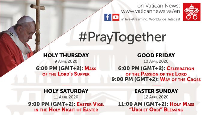 All All of Pope Francis' Easter Triduum liturgical celebrations will be broadcast life on the on the Vatican Youtube channel #PrayTogether
